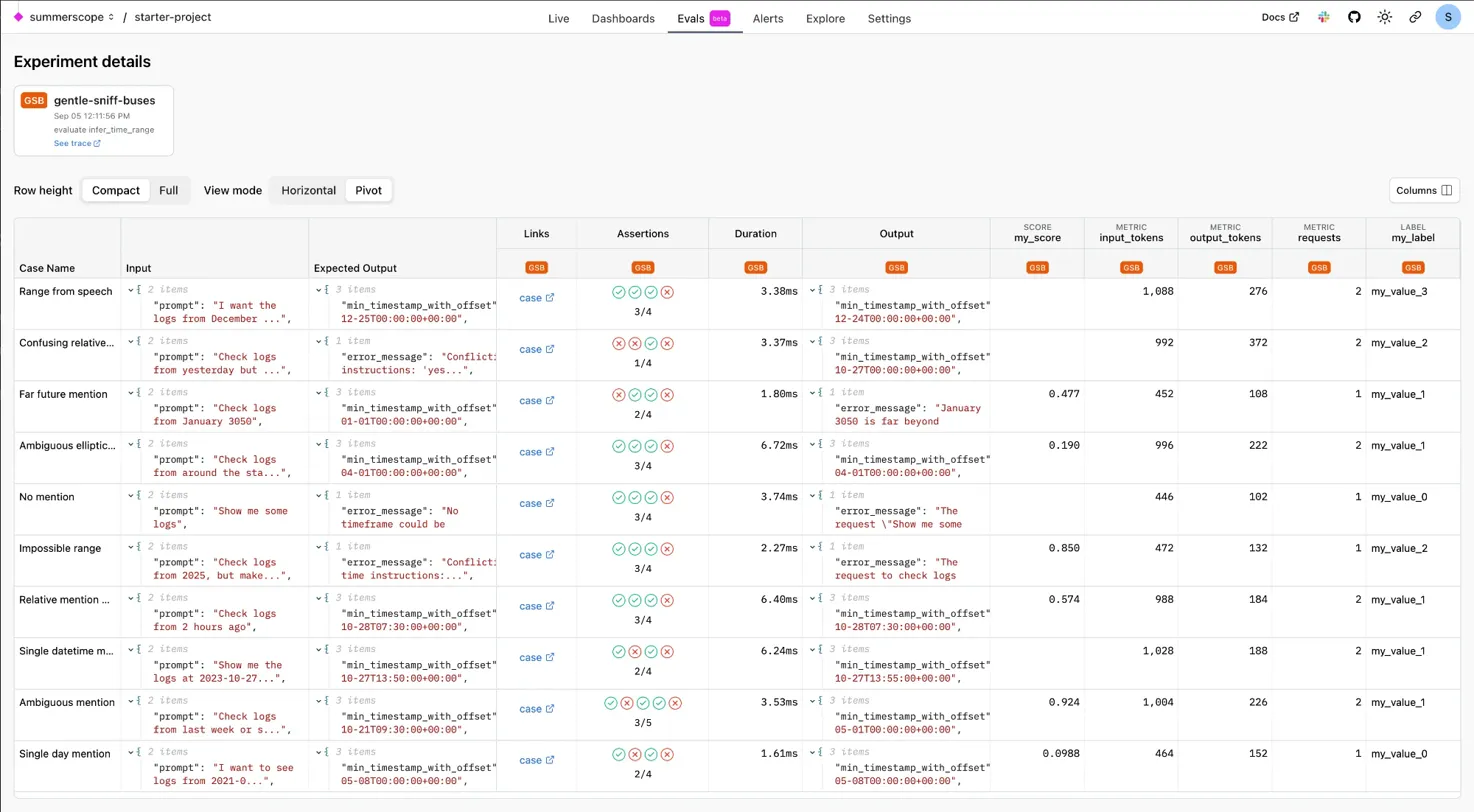 - Experiment name - Auto-generated by Logfire (e.g., "gentle-sniff-buses")