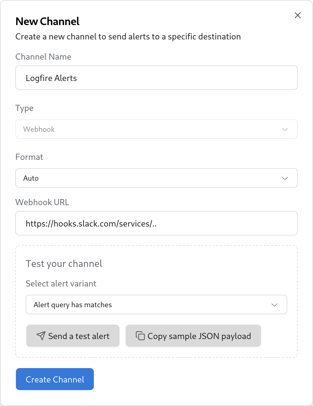 Logfire uses Slack's Incoming Webhooks feature to send alerts.